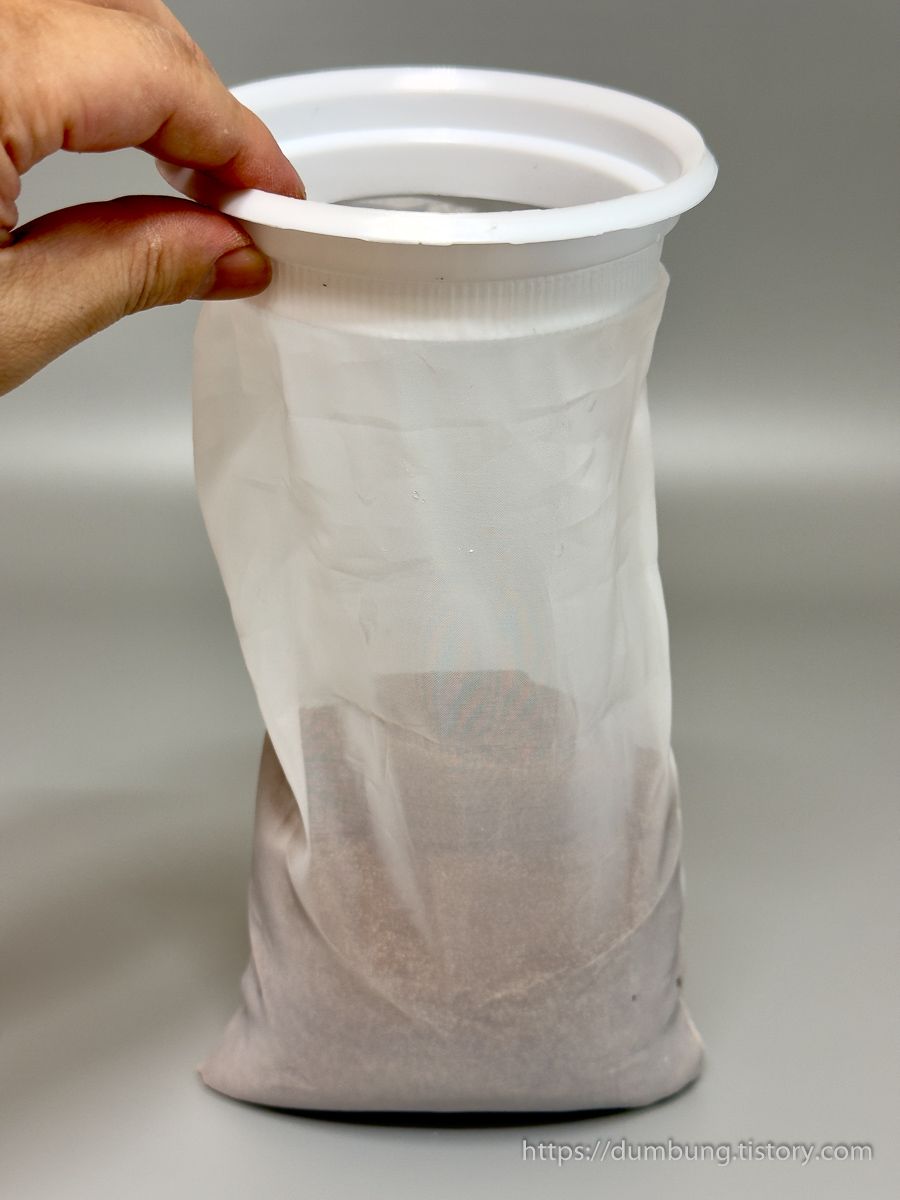 (2) 20리터 말통의 넓은쪽 주둥이에 양말 필터를 겁니다. 이런 거 할 줄 알았다는 듯 잘 들어맞습니다. 4인치 = 10.16cm니까 살짝 크긴 하지만 대세에 지장 없습니다.